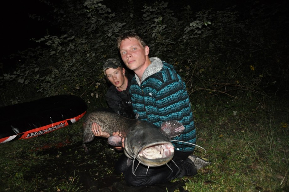 Het is net voor elven en opeens POEF! Dobber verdwenen nergens te bekennen. Rustig blijven bas zie ik me nog zo zeggen Draad geven 21, 22, 23, 30. Slaaaaan!! Bam hangen!!! Terwijl ik Kevin hoor zeggen Rustig Drillen sta ik al heerlijk van de adrenaline te trillen op me benen. Ik hoor me Shimano 6000 heerlijk slippen en hoe meer de vis de kant nadert hoe meer we benieuwd zijn naar de aard van het beestje! Al gauw roept Kevin CATFISH!!! Schepnet te voorschijn en hebbes. We staan beide luidruchtig en blij naar een leuk formaat meerval te kijken het schatten van de lengte begon 1 meter nee minder.