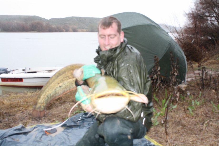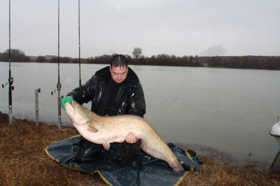 Basje hard aan het werk in de regenMijn beurt was gekomen en het duurde niet lang of een hengel vouwde gevaarlijk ver dubbel en ik stond mijn eerste vis te drillen. Tijdens mijn dril ging er nog een hengel af en nu stonden we samen te drillen. Wat een beleving! Helaas door de natte ondergrond "floepte" mijn vis na het onthaken, tijdens het landen van Tommy's vis terug de Ebro in. Geen foto dus.