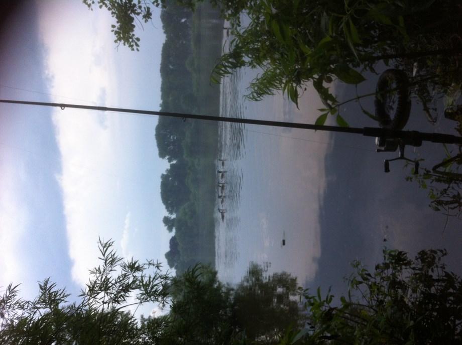 Om 4.15 uur hoor ik mijn beetmelder schreeuwen en als ik met een half oog naar buiten kijk staat mijn afgespannen hengel zo krom als een hoepel te stuiteren in haar steun. Onder de struik zie ik nog een flinke kring in het water waar zojuist nog de brasem zwom. Half slaapdronken glibber en glij ik richting mijn hengel. Onder mijn schoen hangt inmiddels een plakkaat modder van ruim 5 cm dik. Moeizaam krijg ik de hengel uit de steun gepakt terwijl de vis volle gas tegen de stroming inzwemt…wat een geweld! Het is geen hogere wiskunde om je te bedenken dat dit een vis van respectabele afmeting moet zijn!! Niet iedere vis trekt zo’n bezemsteel krom tot in het handvat tegen de sterke stroming in! Door de korte oever en de hoeveelheid blubber kan ik niet echt fatsoenlijk aanslaan met mijn slaapdronken kop en ik ga er min of meer wel vanuit dat de vis goed gehaakt is op de 0,40 breeklijn. Als ik nu te veel tegendruk geef wordt ik simpelweg getrakteerd op een baantje zwemmen hetgeen niet echt verstandig is met deze stroming. Met alle kracht die ik kan en durf te geven probeer ik de vis te blokken terwijl deze volop door mijn dichte slip heentrekt. De vis geeft ook alles wat ie geeft en blijft ongehinderd tegen de stroom inzwemmen. Even maak ik me ongerust daar de lijn langzaam om een struik dreigt te lopen als plots de druk wegvalt. Als een malle draai ik mijn lijn binnen daar ik nog denk dat ie van richting veranderd en mogelijk naar me toe zwemt. Maar als ik de dobber, wartel en vervolgens mijn lege haken zie weet ik dat het gedaan is met de pret. Teleurgesteld pleur ik mijn hengel in de blubber en plof ik neer op mijn stretcher. Langzaam dringt het besef tot mij door wat er nu eigenlijk allemaal gebeurt is en dat dit waarschijnlijk een recordvis is geweest. Ik probeer te analyseren wat er nu eigenlijk mis is gegaan…ik gebruikte een afwijkende montage met enkele haken….ik kon niet nogmaals de haak zetten…..ik gebruikte waanzinnig grote aasvissen. Maar mijn conclusie was eigenlijk even eenvoudig als ook zuur….de combinatie van factoren leidt meestal tot ongeluk en ook nu zal het niet anders zijn.